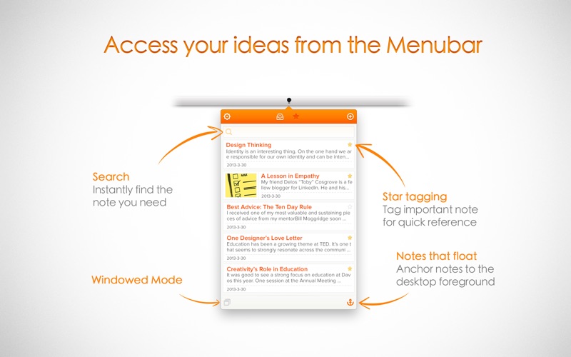iDea note pins itself to your menu bar, and with a click it will drop down or disappear for easy access. Additionally, you can allow it to float above the other applications on your desktop, keeping your needed information visible for as long as you need access.