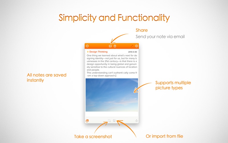 iDea note provides an elegant and accessible note taking interface for your Mac. Jot down ideas, paste links, and save pictures that are instantly uploaded to iCloud and shared between your Macs. Rich in features, iDea note is the ultimate “visual clipboard” for inter-application productivity.