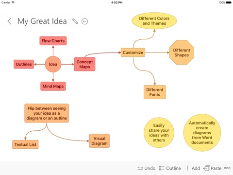Diagrams and outlines can be easily shared via email or the cloud (Dropbox, Google Drive, OneDrive, Box) and copied directly into other apps. Diagrams can also be saved to the Photos app (to sync to your desktop) or uploaded to Facebook.
