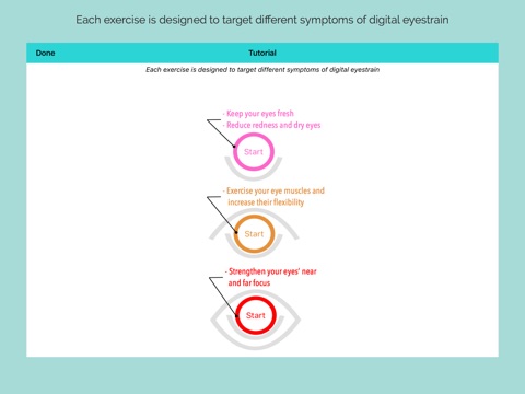 iDetox features eye specific exercises to help relief eyestrain fatigue and help maintain fresh eyes throughout the whole day. Each eye exercise is designed to combat different symptoms of Digital Eye Strain Syndrome.