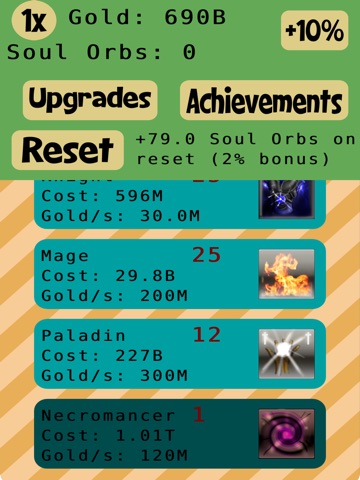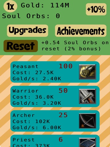 Build up your units to collect gold that you can use to buy more units. This idle game has 8 unit types, upgrades for each, and achievements at certain intervals. Later in the game youll start collecting soul orbs that give you a permanent gold boost when you reset. Gold is also generated offline so you dont need to keep the game open while you wait.