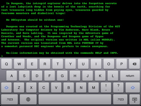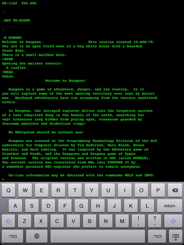 iDungeon allows you to play the more than 40 years old text based adventure game «Dungeon» that was once popular on the PDP 11 and similar systems. The game is running on a stripped down version of the RT11 operating system.