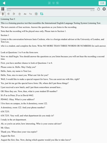 《懒人考雅思》提供了【生词】【收藏】【字典】【单词测试】【单词拼写】等附加功能, 可以将文中任意单词加入到【生词】, 生词在文中用【特别的颜色】标识, 把喜爱的课程加入到【收藏】, 对任意单词进行检索, 测试和拼写练习. 多种播放模式: 单句, 单句循环, 全文, 全文循环, 全书循环, 支持后台播放, 可切换英汉对照模式与纯英文模式. 新增语速调节功能, 三种语速, 任意调节.