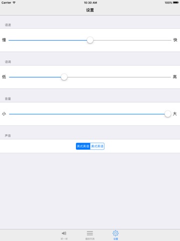 不喜欢英式英语?说话速度太快吗?语调太高音吗?还是音量太大了?不用担心!这些偏好都可以在设置里面调整。可调整的设置包括语速、语调和音量,你还可以调整用英式英语还是用美式英语!