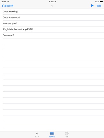 觉得每次听都要输入整个句子或单词很麻烦吗?iEnglish 还设有播放列表功能,你可以把不同的单词或句子放进不同的播放列表里,想听的时候,一键就能听!