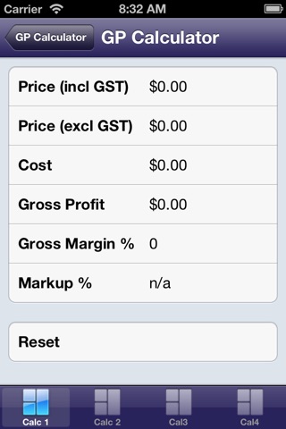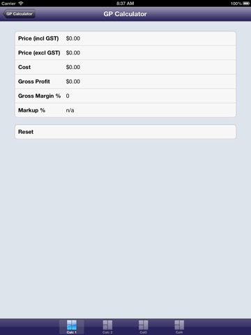 The GP calculator is a quick calculator for buyers and sellers that calculates GPs, Cost, Sell and Profit on a product by product basis. In this regard the calculator can work on a product basis and the user is able to change 1 variable and note the commensurate changes in all the other variables for that product. You can therefore use it to calculate sell prices, cost prices, profit margins in percentages or dollars, and you have 4 screens so you can compare scenarios. You also have the ability to change GST rates so it is equally useful no matter what GST rate may be in effect. So the calculator can be used to answer for example: