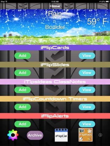 iFlipTipsPro (with no ads): Description all features have multi-media text, audio, video, image functions: 1) iFlipTips - Flipcards-Flashcards - digital note cards, 2) iFlipSlides for presentations and quick reference job aids, 3) iFlipNotes personal notecard tips, 4) iFlipCountdownTimer - countdown timer for events, reminders, 5) iFlipAlerts - canned and custom alerts, 6) iFlipCal - study calendar and 7) iFlippads multimedia notecards for iPhone and iPad.