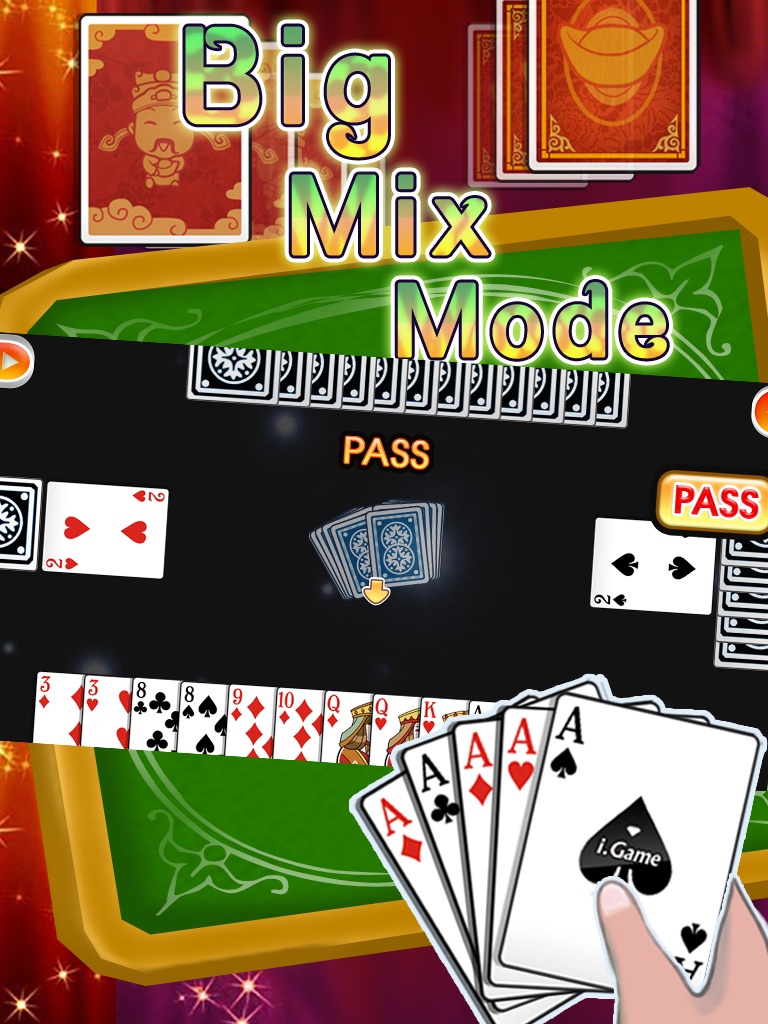 i.Game Big2 Big Mix Mode is a challenging variation which uses 2 card sets (104 cards) while dealing 52 cards.