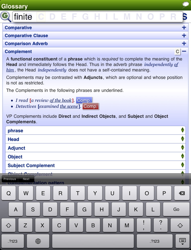 • A complete grammatical glossary: a searchable A-Z of grammatical terms (see the picture below).