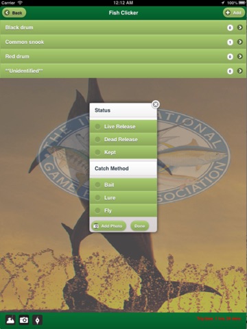 The IGFACatchLog, customized for fishing in Everglades National Park, provides recreational anglers with a way to record catches from their fishing trips and contribute to data collection efforts. Record all catches through a photograph or a Fish Clicker for a quick tally of each catch. Simply snap a photograph and a Visual Identification component will help identify 28 saltwater species by returning a list of potential matches. Anglers must record species, gear used, and whether each fish was kept or released. The app automatically captures the time and location of each catch. Log into www.IGFACatchlog.org to analyze catches by date, gear used, tide conditions, and many other aspects that provide greater insight into what contributes to fishing success. Share photos with friends through Facebook and keep a photo journal of all past fishing trips from within the app and the website. At present, users are limited to approved members of the IGFA Evaluation Team who are participating in an assessment of the utility of this method of recording and reporting catches for management and scientific purposes. Users must register with www.IGFACatchlog.org where they will have access to a variety of useful tools for evaluating their fishing success and patterns.