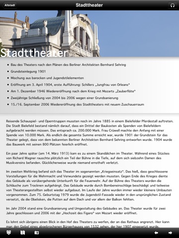 In etwa zwei Stunden führt Sie iGo Bielefeld komfortabel zu den Sehenswürdigkeiten der Stadt: Von Kirchen, Museen über Adelshöfe bis hin zu Dr. Oetkers Ideenschmiede gibt es eine ganze Menge zu sehen und vor allen Dingen zu hören.