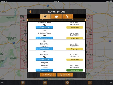 - Select GMUs to view its summary of big-game, predator and game bird seasons (works offline)