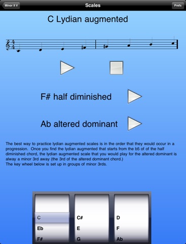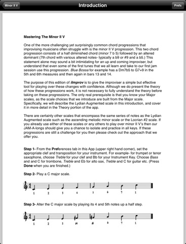 The Minor II V is one of the more common, yet often ‘fluffed’ over, progressions found in the jazz repertoire. Our goal is to take the mystery out playing over these progressions. The Jam-A-Long includes focus on individual chords as well as in a progression. We have also defined the scale to chord relationships for each key and allow the user to listen to the isolated scale as well as hear it over the appropriate chord. We also offer a method to best practice these scales and progressions.