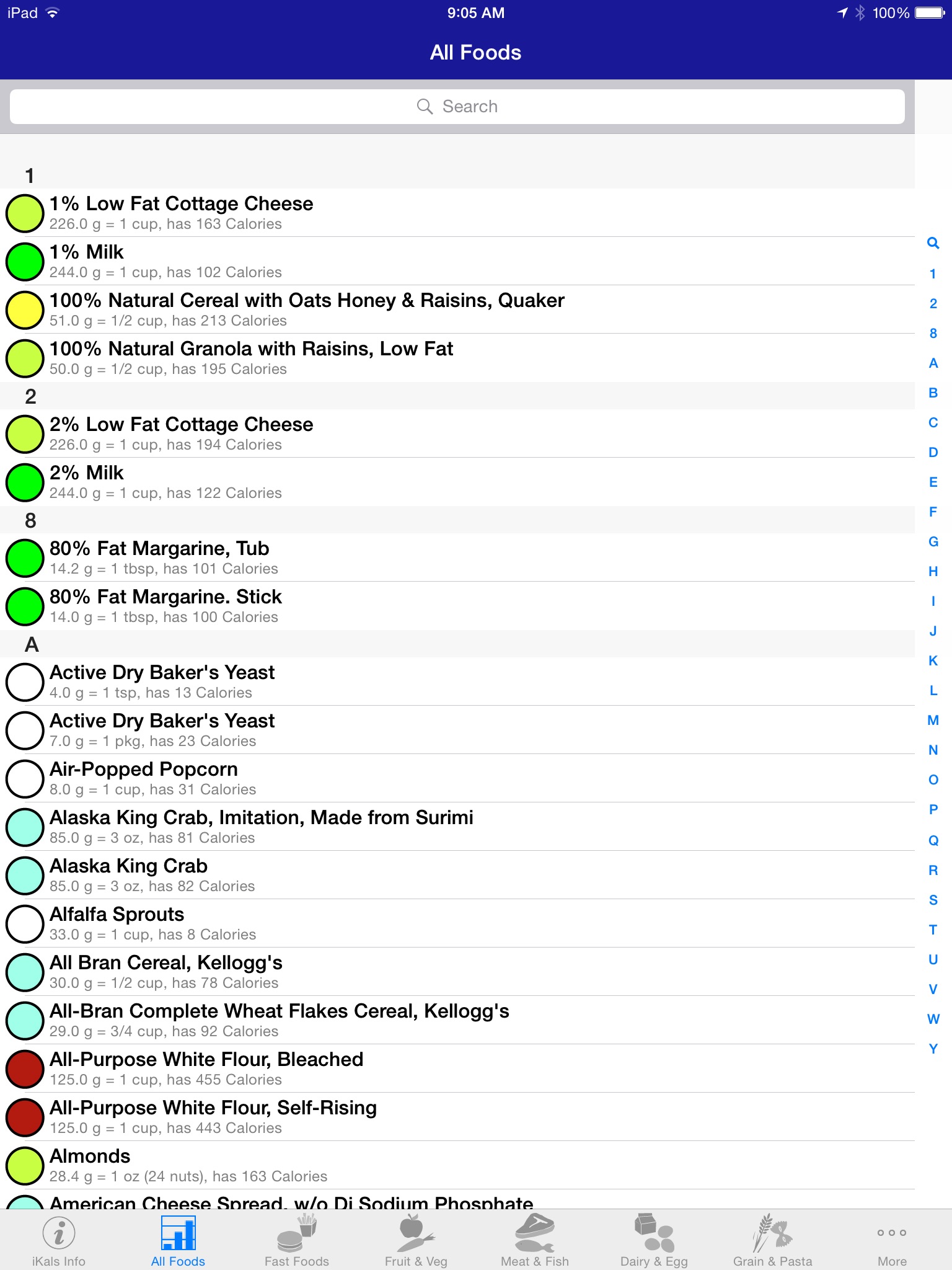 The iKals app provides information about foods and how they are rated for Calorie content. This is provided as a means to assist in deciding which foods to eat. The food servings are rated from EXTREMELY LOW in Calories all the way up to EXTREMELY HIGH. The following colors help readily identify which is which: