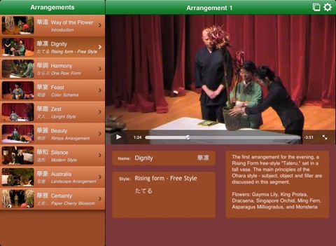 Ikebana Kado showcases a colorful and informative demonstration event entitled “Way of the Flower”, by Professor Hoki Hara from the Ohara School of Ikebana. Eight arrangements are presented as separate video clips, each containing a commentary outlining the features, flowers and techniques of the display.