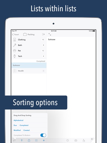 - drag and drop to sort list items, or automatically keep a list sorted alphabetically, by modification date, completion date, and more