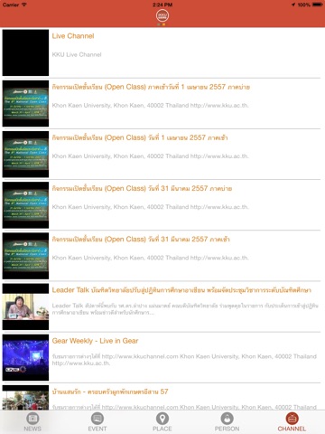 ผู้ใช้สามารถดูข่าว กิจกรรม ค้นหาสถานที่พัก ร้านอาหาร ร้านกาแฟ ห้องสมุด ห้องประชุม ตู้เอทีเอ็ม จุดจอดรถบัสใน มข และรอบๆ มข ค้นหาอีเมลของบุคลากร มข และดูวิดีโอที่อัปโหลดที่ KKUChannel