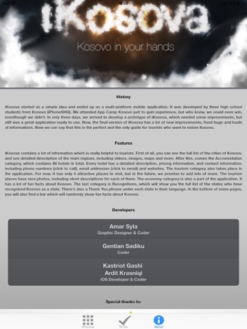 iKosova started as a simple idea and ended up as a multi-platform mobile application. It was developed by three high school students from Kosovo (iPhoneSHQ). We attended App Camp Kosovo just to gain experience, but who knew, we could even win, eventhough we didnt. In only three days, we arrived to develop a prototype of iKosova, which needed some improvements, but still was a great application ready to use. Now, the final version of iKosova has a lot of new improvements, fixed bugs and loads of informations. Now we can say that this is the perfect and the only guide for tourists who want to exlore Kosovo.