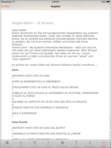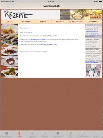 With this app you keep in touch with the Ristorante Il Grano in Buren an der Aare. Find out more about current events, contact us and reserve a table quite easily from your mobile phone. Moreover you also receive regular insider information directly from the chef and his team!
