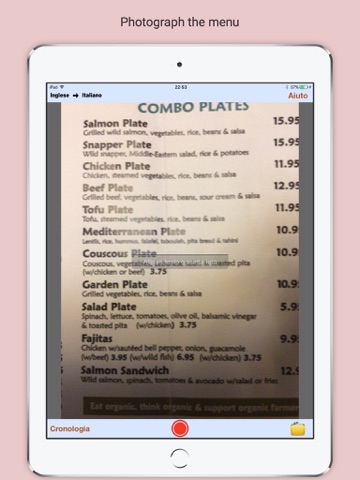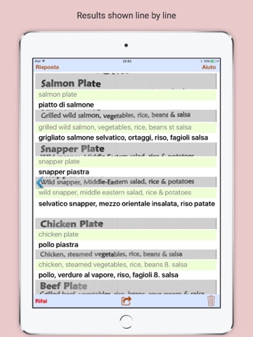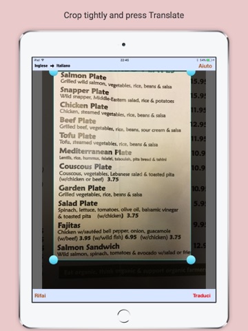 Order easily from an English-language menu. Take a photo, crop as needed, and hit "Translate." Thats it! Each line of Italian is immediately below the line of English, so you can point to your choice.