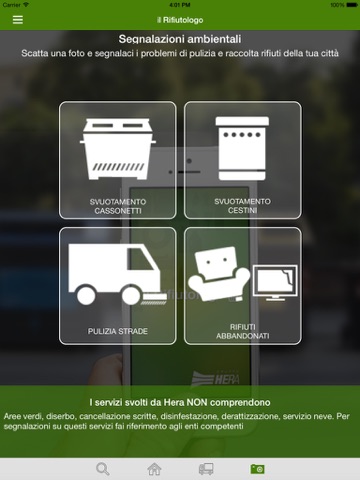 - Se risiedi in un comune con più di 30.000 abitanti, nel territorio gestito da Hera, puoi utilizzare l’App anche per segnalare con una foto un problema che riguarda i servizi svolti dallazienda: dai cassonetti di immondizia troppo pieni, ai rifiuti abbandonati, fino alle richieste di pulizia strade. Il Rifiutologo individuerà automaticamente il luogo della segnalazione e invierà in tempo reale un messaggio personalizzato ai tecnici Hera.