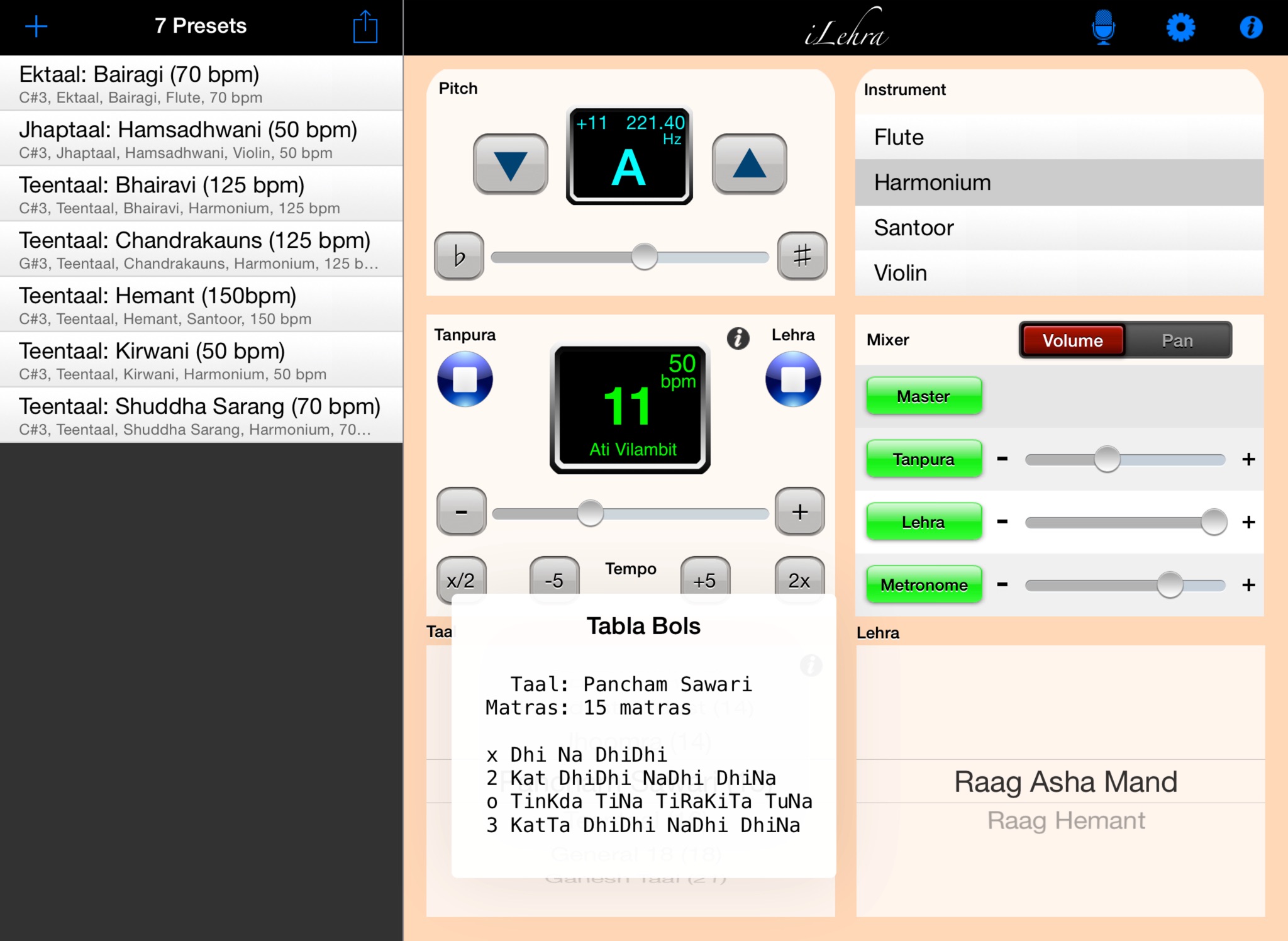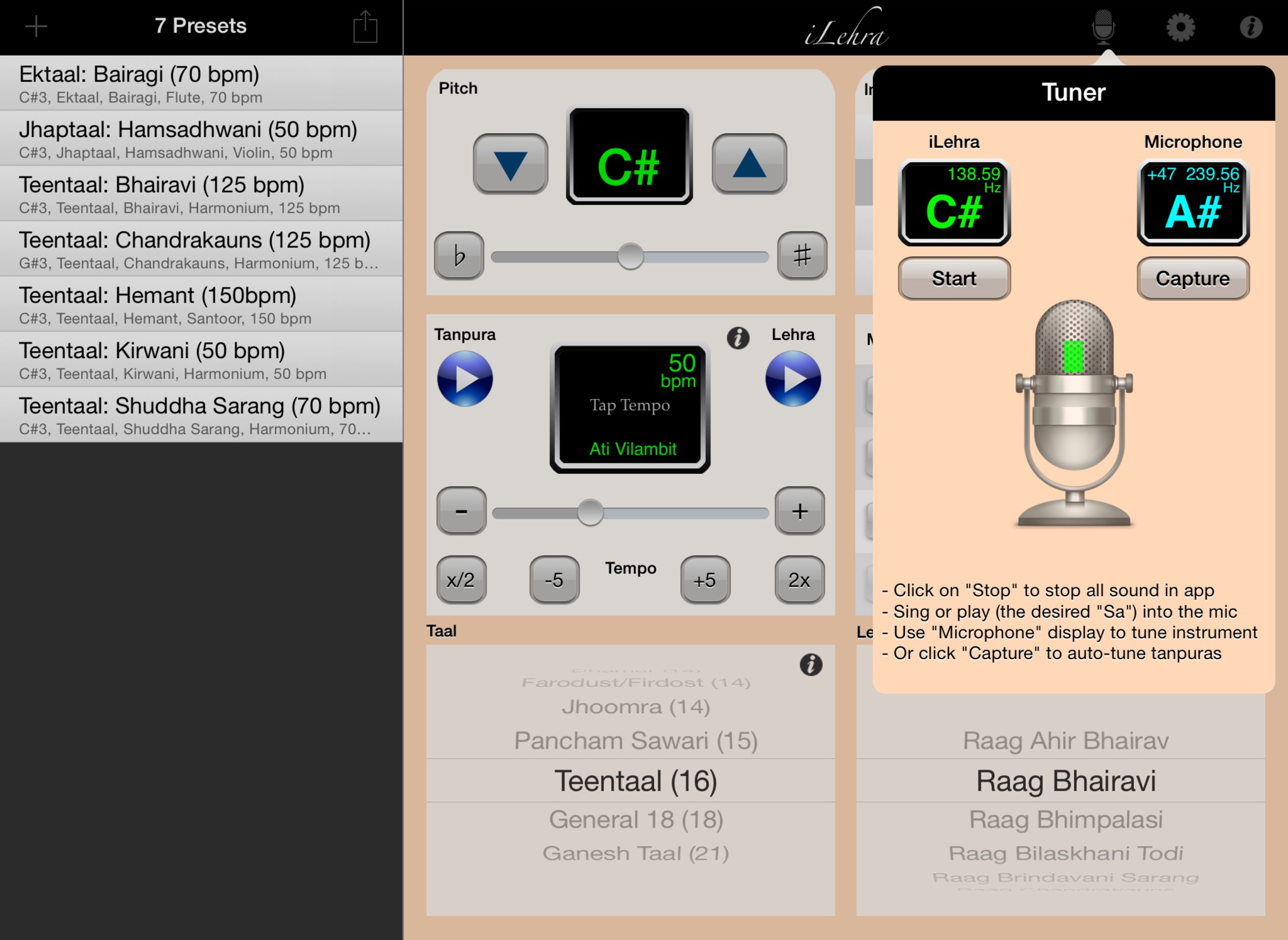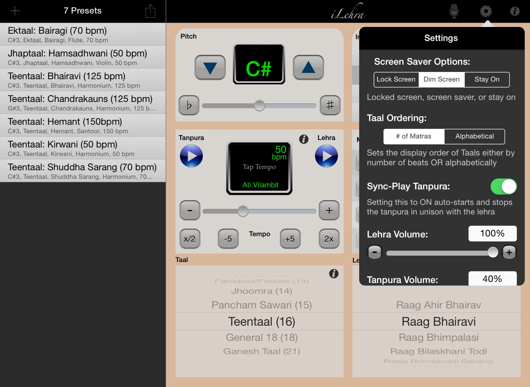 Im using it since a year,this is by far the best lehra app!!! Works perfectly,fast and easy to use,tons of taal including rare ones,lots of features and options,big choice of raags for nagma/lehara,and frequent updates. Excellent,very complete and serious app! I was expecting this for a long time! Je lutilise depuis un an,cette app est sans hésitation la meilleure du genre! Marche parfaitement,pleins de taal et doptions,des updates fréquents,grand choix de differents raags. De très loin la meilleure!