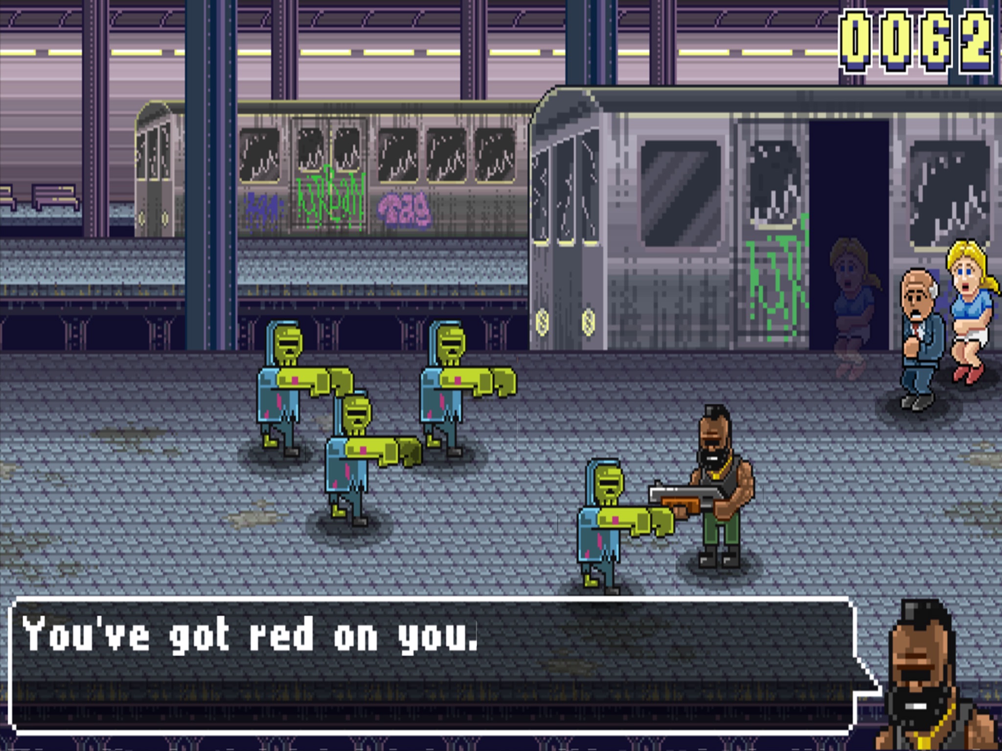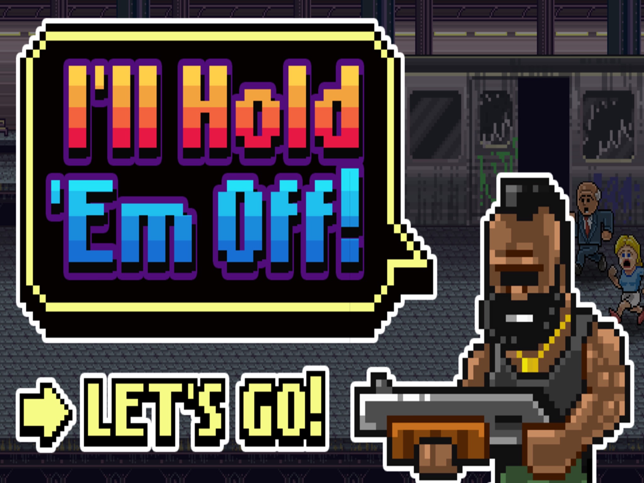 Hold Them Off! is a splatter-fest survival game. Hero, Laurence Tea, has accepted his fate. In a last ditch effort to meet his maker with a clear conscience, he has decided sacrifice himself (and lots of ammo) to save as many civilians as possible from the encroaching zombie horde. That is, until he gets his brains eaten!