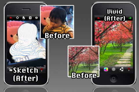 Saturate the color of the photo to make it more " Vivid ". Just use the finger to saturate any area of the photo as you wish, or use the provided "invert" function to saturate the entire photo.