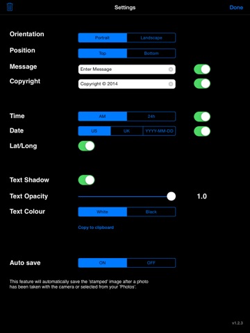 Use this app to add a variety of different watermark properties to your photos. Use the settings to turn on/off the various overlays.