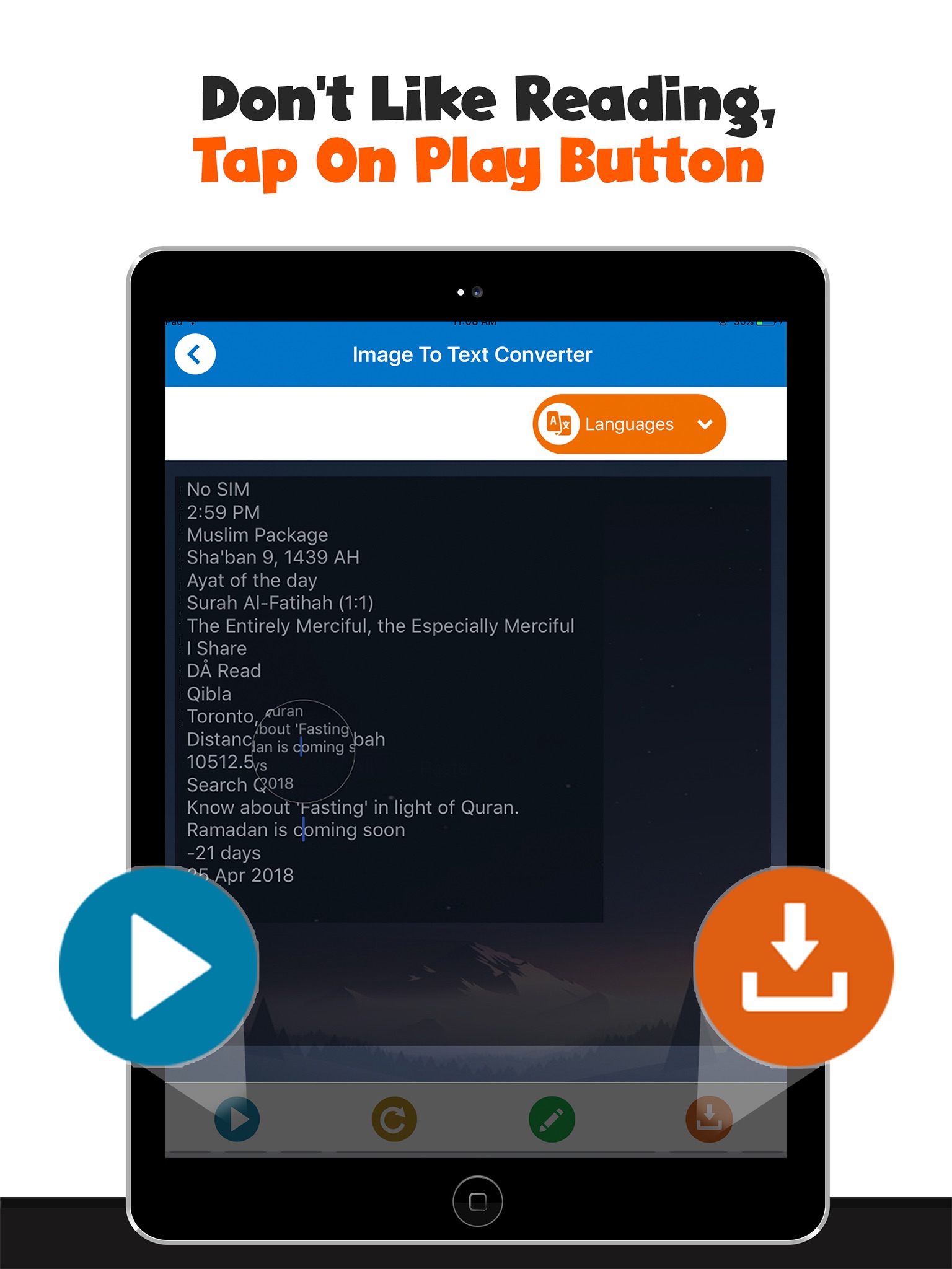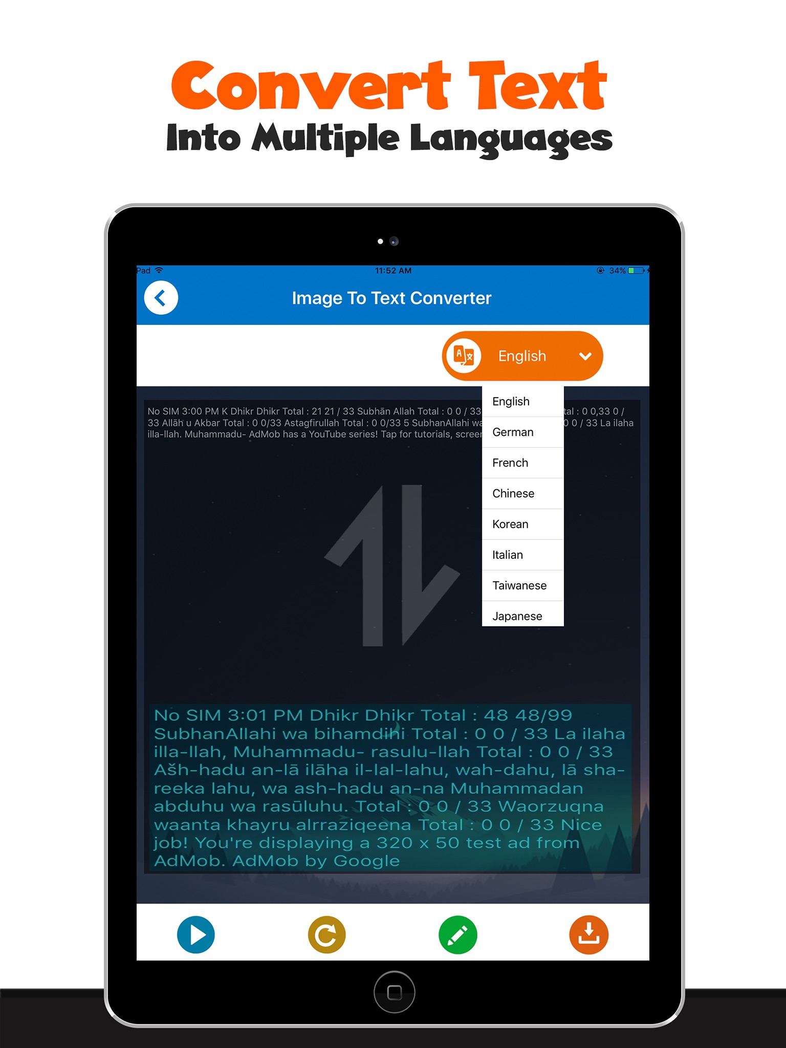 One of the core features of Image to text converter, PDF OCR Scanner is translation in multiple languages. You can not only convert (OCR) image in to text but you can convert text in to any of the desired language and can be listened in native language with text to voice feature.