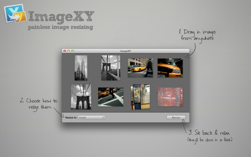 ImageXY allows you to resize all your photos quickly and easily with the click of a button. Drag & drop your images directly into ImageXY from wherever you keep them and select how you want them resized...it’s that simple.