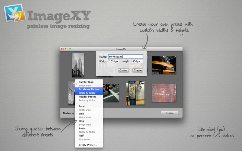 Have you ever tried to upload or email a photo only to have it rejected or timeout as it’s too large? Have you ever been frustrated at how long it takes to upload a photo directly from your camera? Have you ever gone through and manually resized all those vacation snaps one by one? If so, ImageXY is for you.