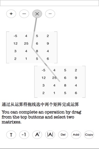 - By draging, you can easily create or delete a matrix, do transpose, inverse, calculate the determinant and so on, you can also drag to select two matrices to add, minus or product them.