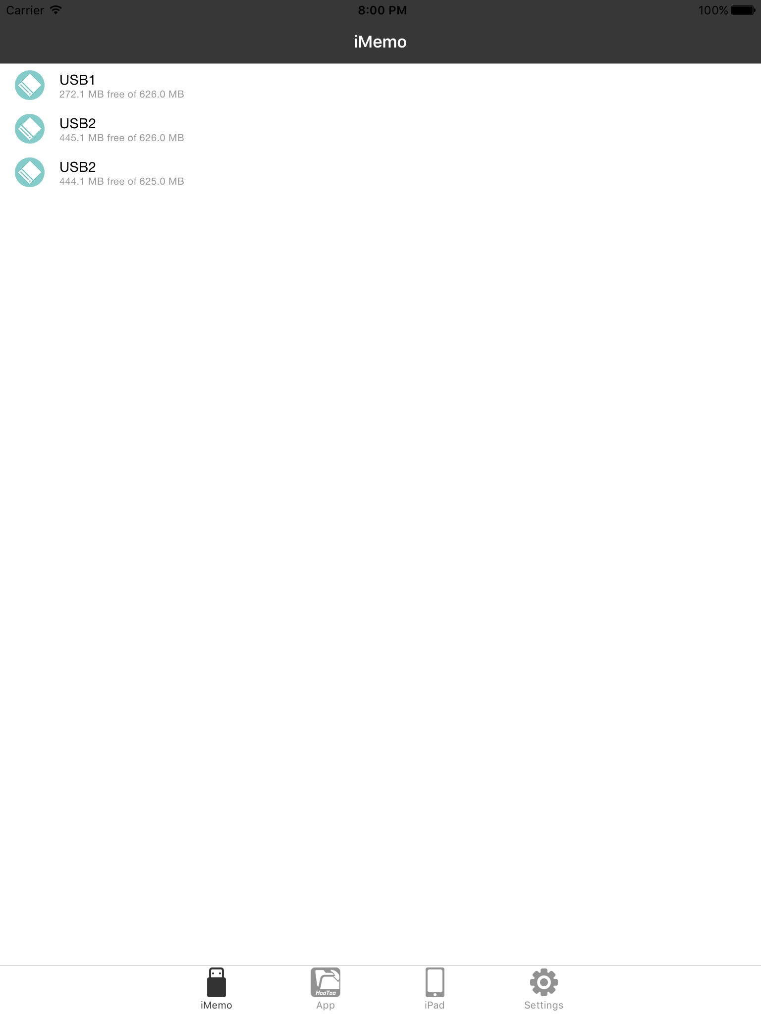1, USB3.0 A, to connect to Mac or PC. In this way, iMemomate acts as a general USB drive. Users can manager files in it, copy, cut, past or delete, ect. Users can also browse files in it directly, including preview documents, playback music and movies.