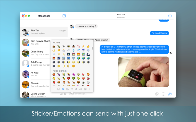 Nice, its like the messenger app for iOS, and works good, loads all conversations, thats great. But the scrollbars stutters, would be nice if it can fixed by developer.