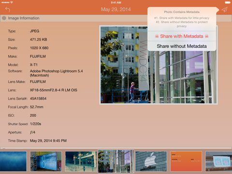 If you care about your privacy iMeta will become your APP in shining armour. iMeta allows you to inspect/remove your photo’s metadata before uploading or sharing with the information world we live in today.