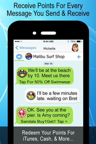 Very small brand icons (similar to emojis) will automatically be included within your messages. Youll receive points for every message you send and receive that includes a brand emoji. You remain in total control and can select your favorite brands, or turn the feature off. Once youve selected your favorite brands, theyll automatically rotate within your outgoing messages, or you can select specific ones on the fly. Cash in your points at the end of each month for iTunes, cash, and more... Earning free stuff has never been so easy!!