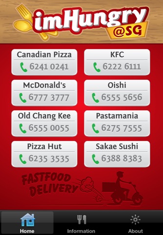 With imHungry@SG, you no longer need to do that. With a single tap, you will be immediately connected to your favourite fast food delivery hotline to order the food you like. imHungry@SG also provides delivery hours of popular fast-food delivery services so you will never miss them as well. Links to the popular fast food outlet delivery food menu can also be accessed on the app to help you decide what you want.