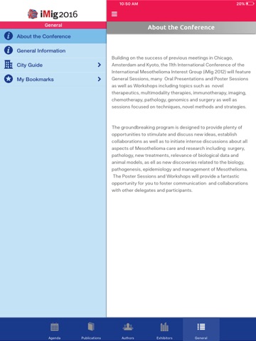 The International Conference of the International Mesothelioma Interest Group (iMIg 2016) expects more than 500 delegates from around the world. The groundbreaking program will feature workshops, general sessions as well as oral and poster sessions including topics such as immunology, immunotherapy, imaging, pathology, genomics as well as surgical pitfalls and challenges. This iMig 2016 mobile meeting application will allows you to
