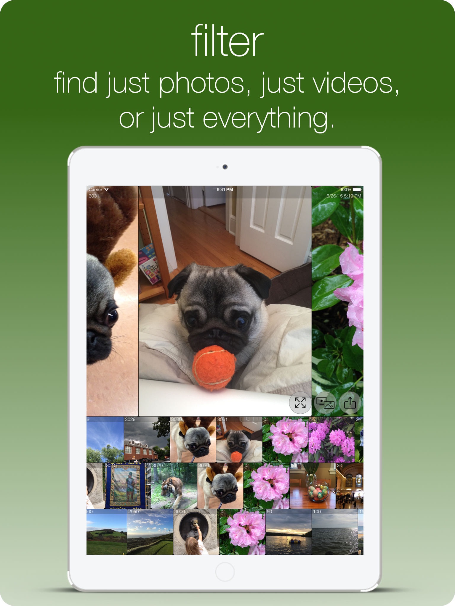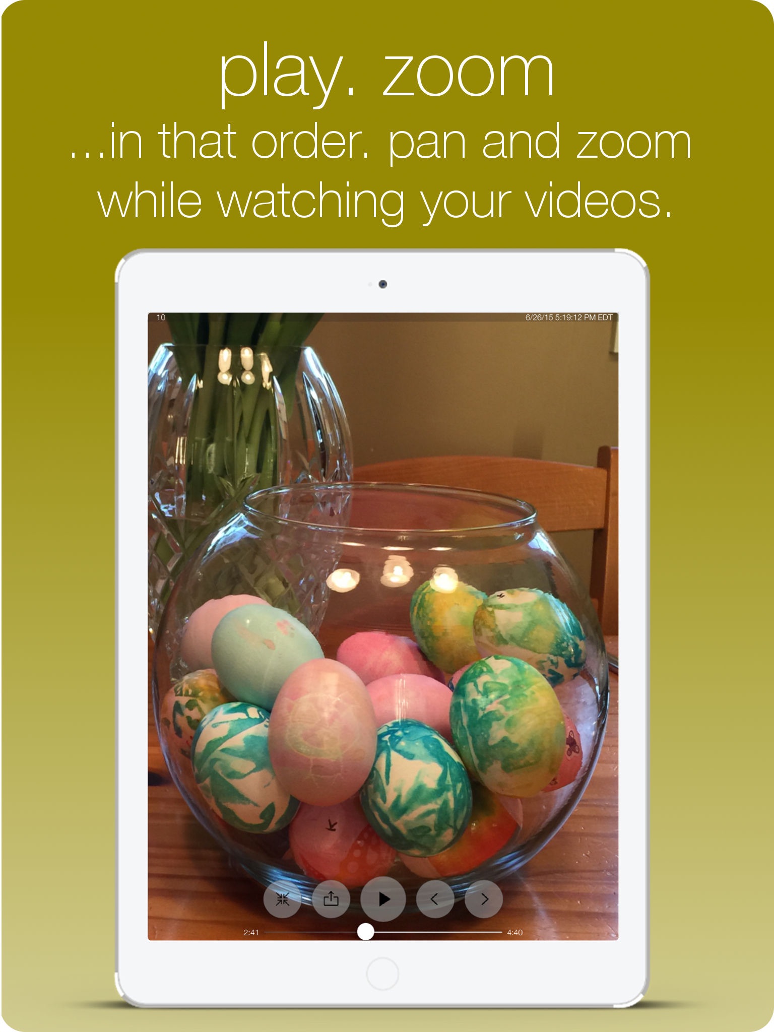 Play and share your photos in full screen mode. Zoom all you want. Live zooming during video playback too!