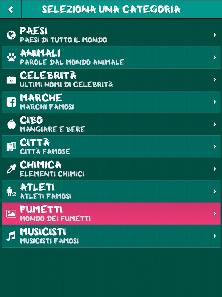 È possibile scegliere tra diverse categorie e di conseguenza vi sarà dato parole da indovinare!