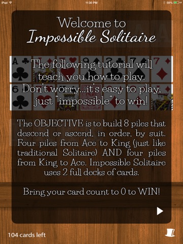 If you like classic Solitaire, you’ll love this exciting new game. As the name suggests, Impossible Solitaire adds a challenging twist to the classic card game we’ve all grown up with. The game uses two full deck of cards and requires you to complete not one, but two, rows before you win. Try to play as many cards as possible before the deal pile runs out. Sound easy? Think again.