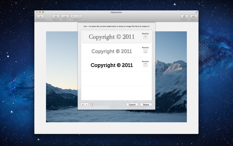 • Create a watermark in the app or import it from an image or an RTF-file