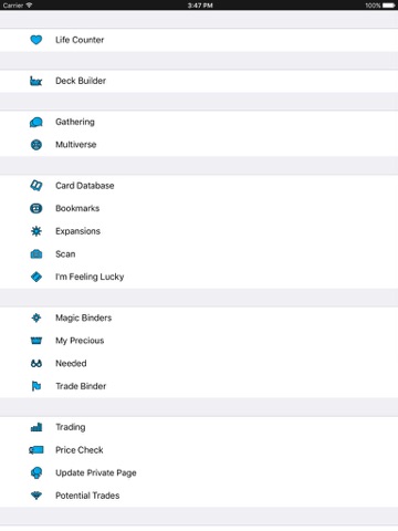 Trade module contains quick Price Check and Trading tool, together with Needed and Trade Binder. Needed list is especially handy when you are heading for your local shop to do some trading and you are guaranteed to wow your friends when you show them what you need in a stunning landscape coverflow view. Prices are courtesy of TCGplayer.com, displayed in configurable currency and multiplied by configurable factor, so you can adjust for your local market. Potential Trades is an automatic trade matching system for Gathering users.