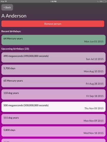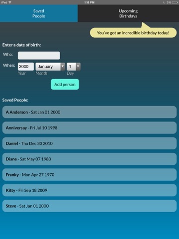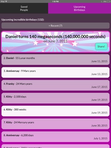 - Add friends & family, and get fractional birthdays (e.g. "Ted is 1/2 the age of Beth today")