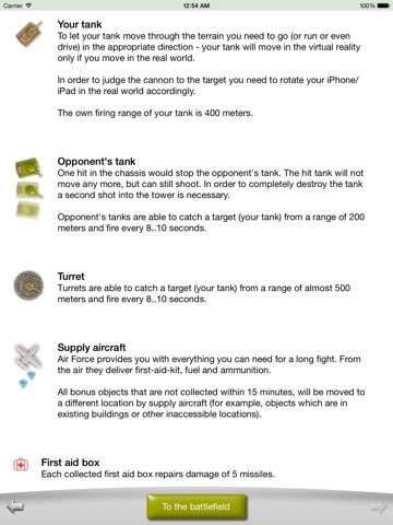 At the beginning of the game all objects are spread, based on a random algorithm, around in a range of about 1000 meters, starting from your own GPS-position. Opponents tanks are moving towards your cities to capture them. Try to stop and destroy them before they reach their destination. Once your city is captured, there will be a turret tower build near it and the flag of the occupant will be hoisted. Such turrets are able to catch a target (your tank) from a range of almost 500 meters. The own firing range of your tank is 400 meters. To liberate a city again you have to destroy all the turrets around the city.