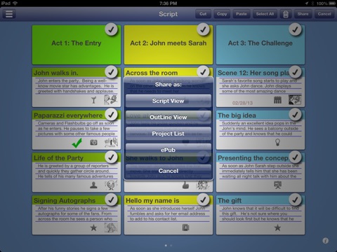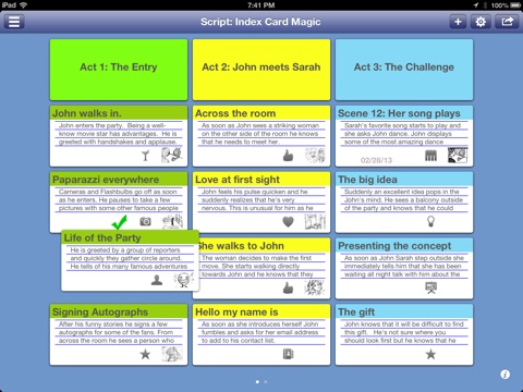 Start with index cards, organize your ideas, and share! You can convert your cards into an outline, script or book - each card can becomes an outline section or book page.