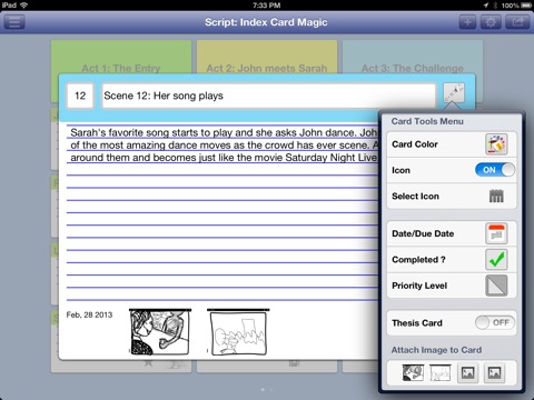 SCRIPT WRITER: Using the the card’s color system, and Thesis card setting, your cards can be exported to a professional looking manuscript. The number and subject of the card are display in bold, and the supporting text describes each scene. Images are also displayed in the output, and each scene is highlighted by the color of the cards.