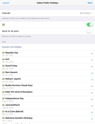 Insert the Indian Public Holidays of 2016 - 2017 into your iPhone calendar with one tap. The holidays will be added as all-day events, you dont need any subscriptions. You can also select beforehand which holidays you want to add to your calendar, and apply this selection across all years.