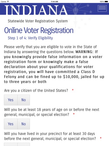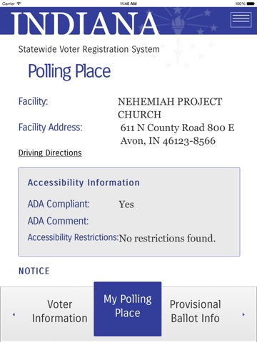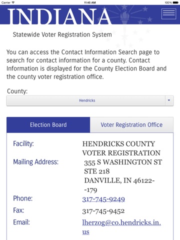 Additionally, the Indiana Statewide Voter Registration mobile app allows you to look up voter registration information, such as confirming your voter registration, finding your nearest polling location with driving directions, viewing which candidates and questions will appear on your ballot, and checking the status of provisional or absentee ballots.